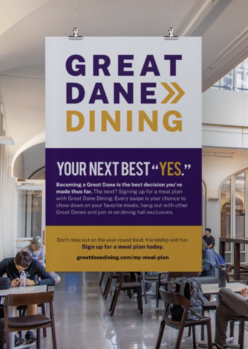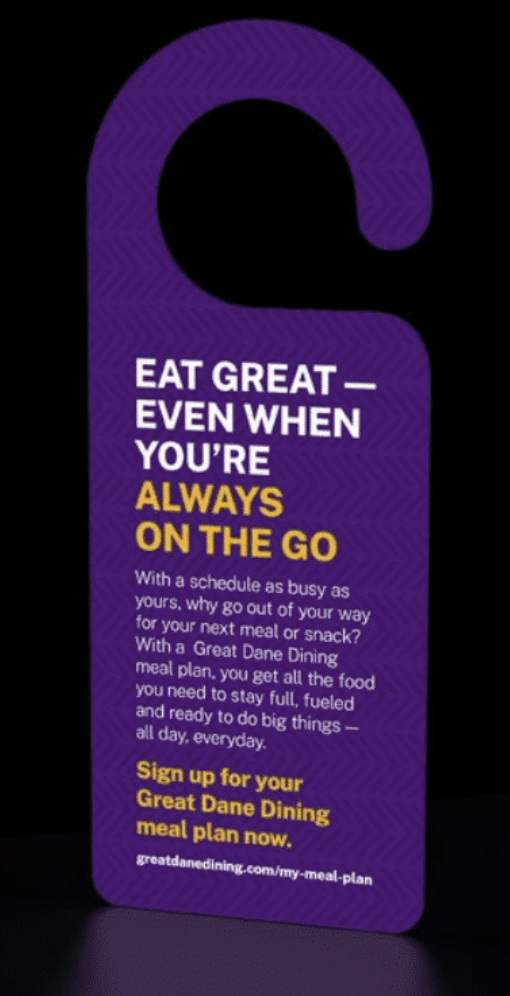 Our creative aimed to tackled a goal of University: Get Great Danes to sign up for a meal plan. We created pieces that would meet students where they were, writing and designing signage in the dining halls as well as door hangers for on- and off-campus housing.