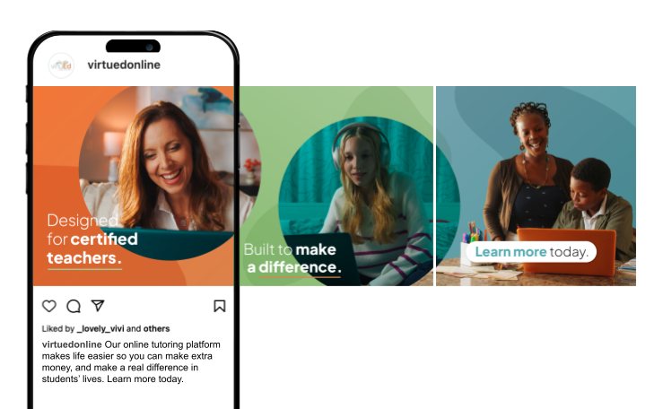 We applied our newly developed brand story and messaging to our creative, which included Meta ads, videos and the VirtuEd website. Because VirtuEd was a new tutoring platform, our primary focus was promoting its name and services and generating interest via brand awareness ads.
